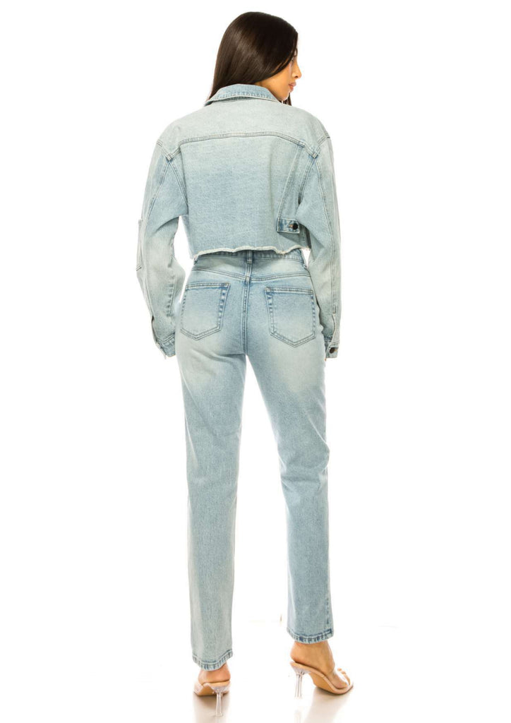 This cropped denim jacket features a light color wash and is designed with detailed pockets, making it a stylish addition to any wardrobe. Crafted from 99% cotton and 1% spandex, it offers both comfort and flexibility, perfectly complementing a cropped crop top and high-rise jeans for a trendy, casual look.